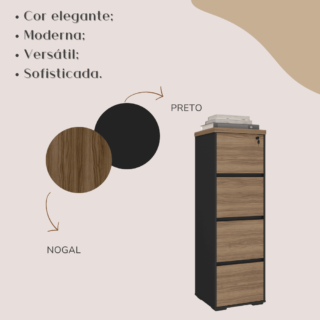 Um design único e contemporâneo garante elegância ao produto, que possui 4 amplas gavetas para acomodar arquivos de forma fácil e prática. Materiais de alta qualidade e trilhos telecópicos garantem que as gavetas suportem grande peso e abram e fechem de forma delicada e uniforme. Conta com chave para que você possa guardar documentos, papéis e objetos pessoais com garantia de segurança e conveniência. Unindo praticidade e elegância, este produto é o que falta para seu escritório ou sua casa!