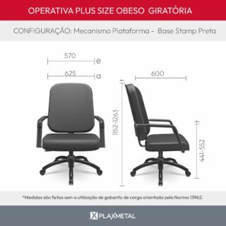 Seguindo o conceito dinâmico da Linha Operativa Plus, o novo modelo Operativa Plus Size criado para atender pessoas com sobrepeso, amplia a versatilidade deste conjunto. Estrutura disponível pintura preta ou pintura cromada.