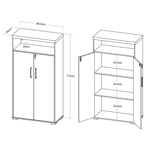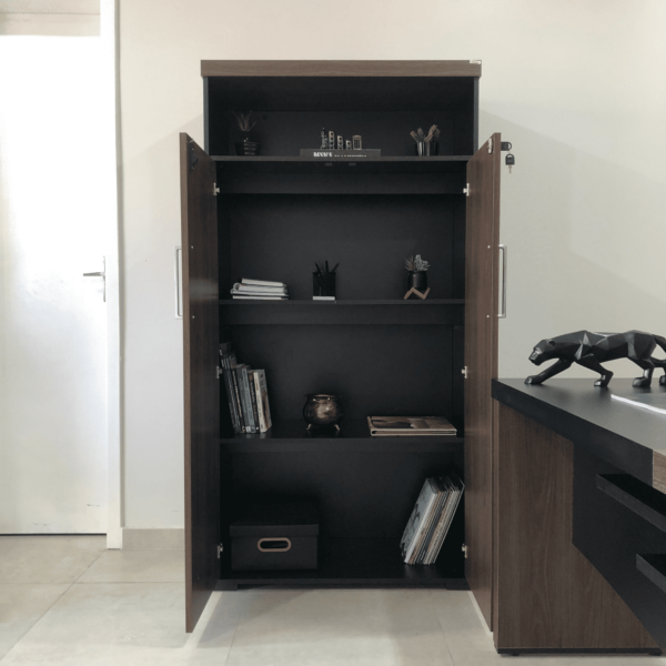 Na parte interna, o armário tem 3 amplas prateleiras, com excelente estruturação para armazenar com segurança e organização seus materiais e pertences. Falando em segurança, você pode trancar as portas do armário e ficar tranquilo de que seus documentos e objetos estarão preservados.