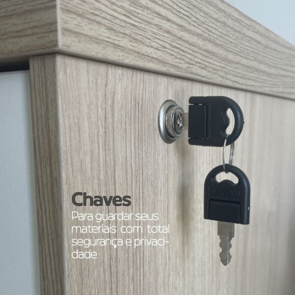 O produto possui puxadores em metal cromado, garantia de qualidade, brilho e resistência. Conta com chave para que você possa guardar documentos e objetos pessoais com total segurança. Unindo praticidade e elegância, este produto é o que falta para seu escritório ser muito mais organizado e produtivo!