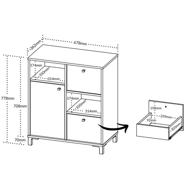 – Uma porta em MDP 15mm com fita de borda ABS 0,45mm de espessura;