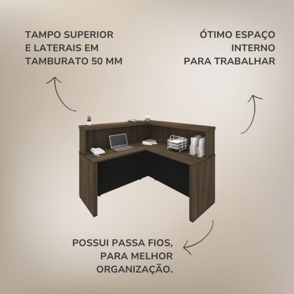 Deseja um ambiente corporativo elegante para receber bem seus convidados e clientes? O Balcão Tamburato Atendimento II é perfeito para isso, pois é um produto sofisticado e ideal para atendimentos. Elegantes longarinas horizontais no produto proporcionam equilíbrio ao ambiente, e peças de Tamburato de 50mm de espessura certificam muita robustez e qualidade. Além disso, na parte interna há amplo espaço para trabalhar de forma organizada e eficiente.