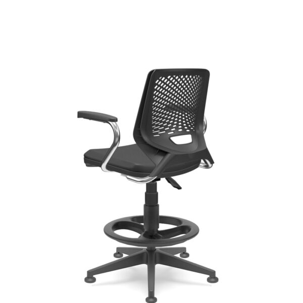 O design moderno da Beezi Caixa reflete-se no encosto e assento, desenhados para oferecerem ergonomia. Compostos em material termoplástico de engenharia, presente também nos apoios de braço, esse modelo da linha possui elevação e apoios para pés, indicados para bancadas mais altas e outras aplicações práticas que exigem acomodação em uma posição elevada.