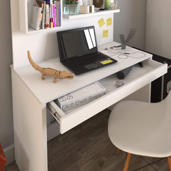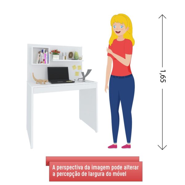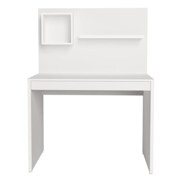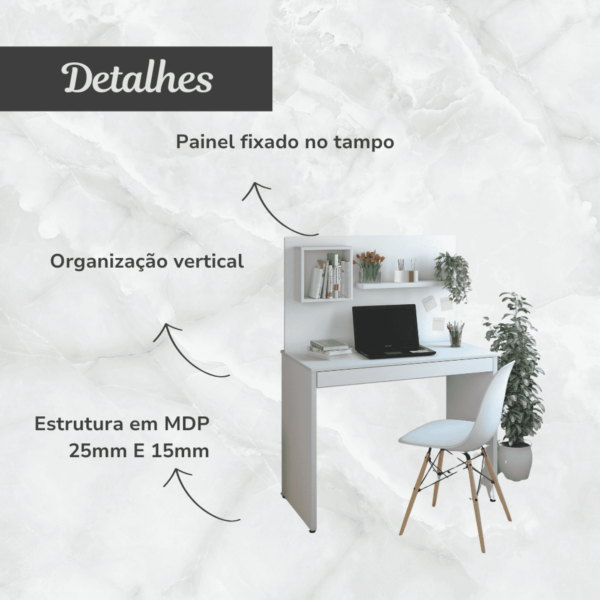 O painel fixo à escrivaninha contém um nicho e uma prateleira, para que você possa organizar ainda melhor seu espaço, com decorações, livros e materiais sempre à mão. Além disso, assim você não danifica sua parede com furos e riscos.