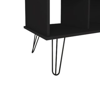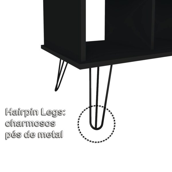 Com estilo industrial, proporcionado pelos pés de metal, os famosos “Hairpin legs” trazem um ar retrô ao design, além de oferecerem uma excelente sustentação ao produto e objetos que forem colocados nele. Falando nisso, a mesa tem muito espaço de armazenamento nas prateleiras e conta com uma porta, que além de ser útil, acrescenta muito no visual.