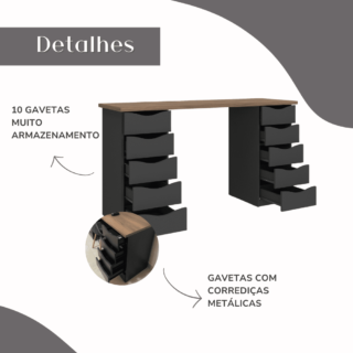 Organize-se para maior produtividade com a Escrivaninha Due, projetada para conciliar elegância, requinte e conforto. Sua forma versátil faz desta mesa perfeita para ser usada em diversos ambientes com estilos diferentes, como em escritório, home office ou quarto, sempre dando um toque especial. 10 amplas gavetas garantem um produto útil e multifuncional, e seu design elegante deixa qualquer ambiente sofisticado e de alto padrão.