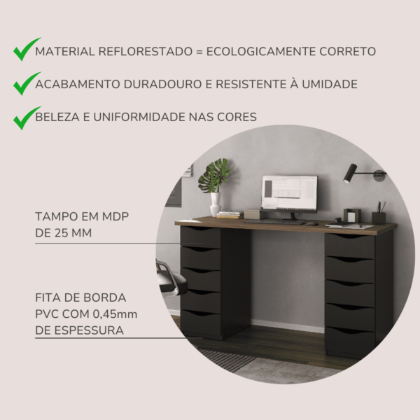 Organize-se para maior produtividade com a Escrivaninha Due, projetada para conciliar elegância, requinte e conforto. Sua forma versátil faz desta mesa perfeita para ser usada em diversos ambientes com estilos diferentes, como em escritório, home office ou quarto, sempre dando um toque especial. 10 amplas gavetas garantem um produto útil e multifuncional, e seu design elegante deixa qualquer ambiente sofisticado e de alto padrão.