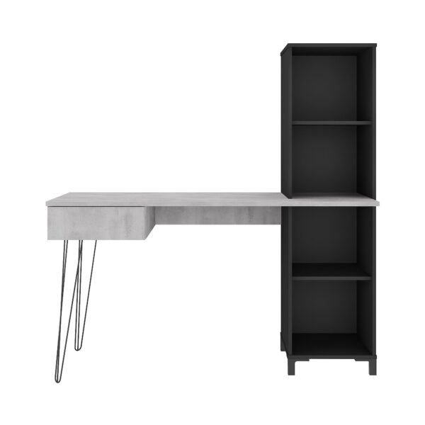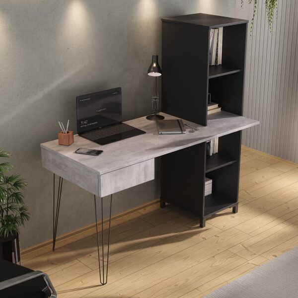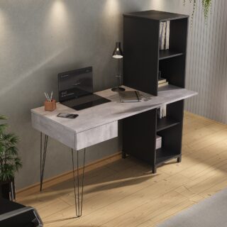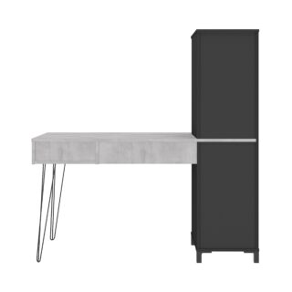 Eleve seu espaço de trabalho com a Escrivaninha Fusion! Inspirada no estilo industrial, ela agrega traços retos e sóbrios com belos pés de metal, chamados “hairpin legs”, além da combinação contemporânea das cores concreto com preto.