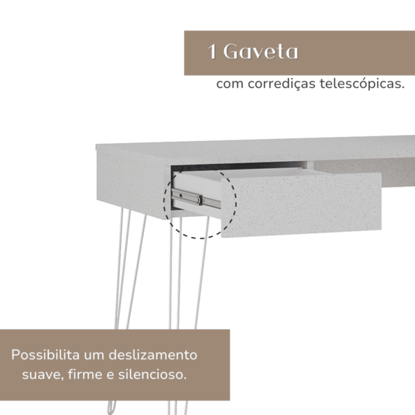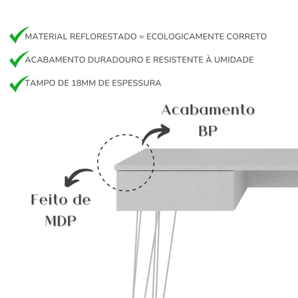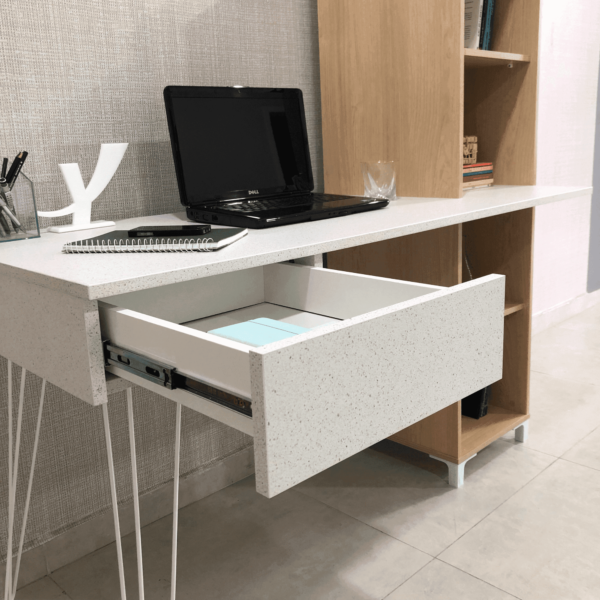 O robusto tampo de 18mm de espessura oferece um generoso espaço de trabalho ou estudo. O grande destaque é pelo acabamento BP na cor terrazza, com aparência de granilite, que é uma grande tendência no design de interiores por trazer suavidade e garantir uma estética única!