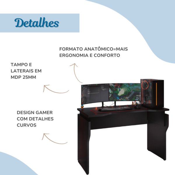 Escrivaninha desenvolvida especialmente para os gamers, com regulagem de altura no tampo garantindo conforto no momento de lazer ou trabalho.