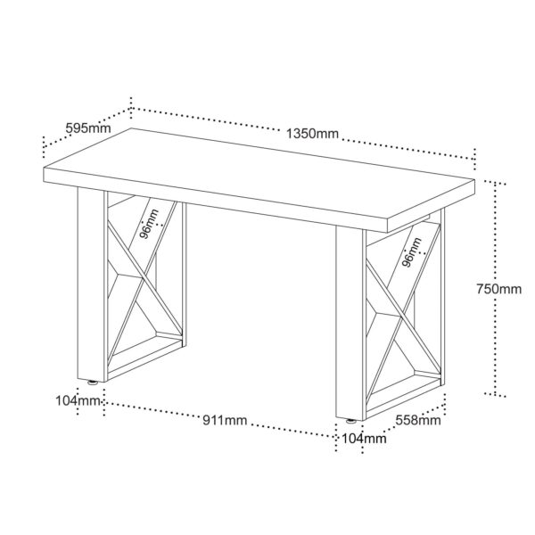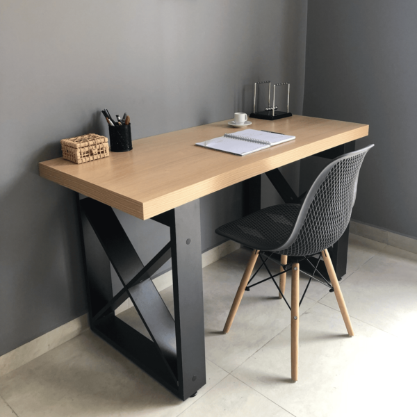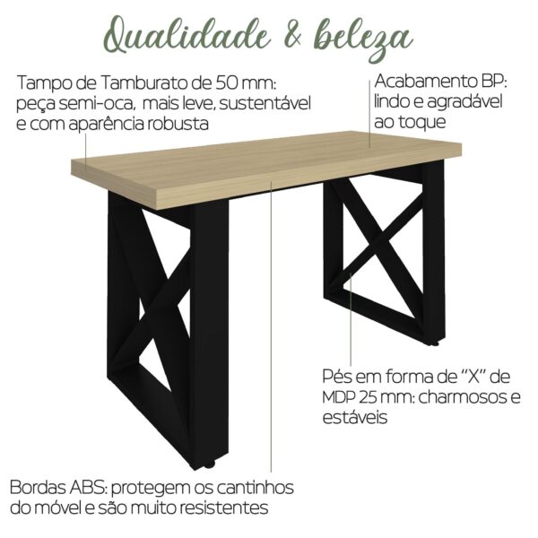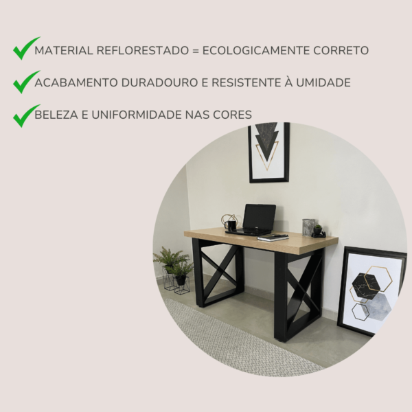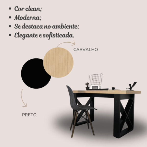 Além da beleza, a estrutura dos pés de MDP de 25 mm tornam a mesa estável, e ao mesmo tempo leve e com um toque industrial. Sapatas com regulagem de altura garantem que sua mesa ficará firme mesmo em caso de pequenos desníveis no chão, além de protegerem seu móvel e seu piso na hora de limpar ou organizar o ambiente!