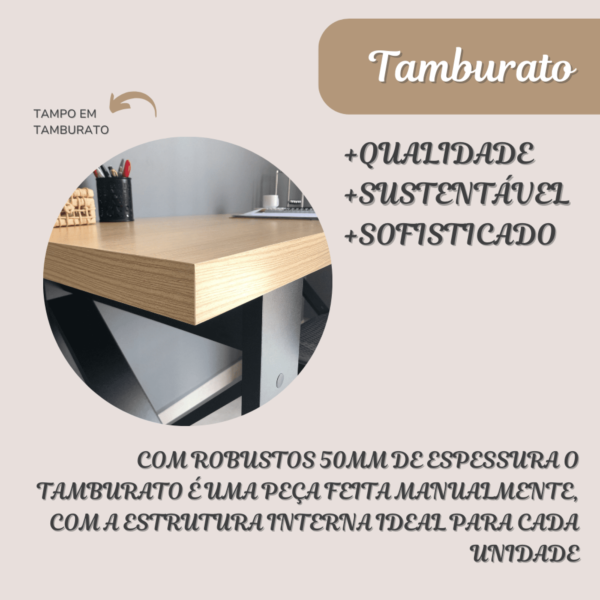 Com tampo de Tamburato de 50mm de espessura, a mesa tem sua aparência muito robusta, além de excelente resistência, enquanto bordas ABS deixam os cantinhos suaves para muito mais conforto durante o uso.