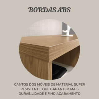 – Laterais, divisória, base e pés em MDP 18mm com fita de borda ABS 1mm de espessura;