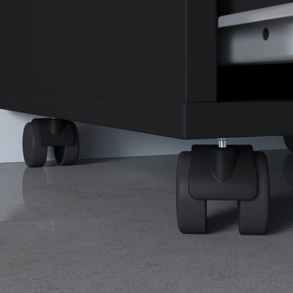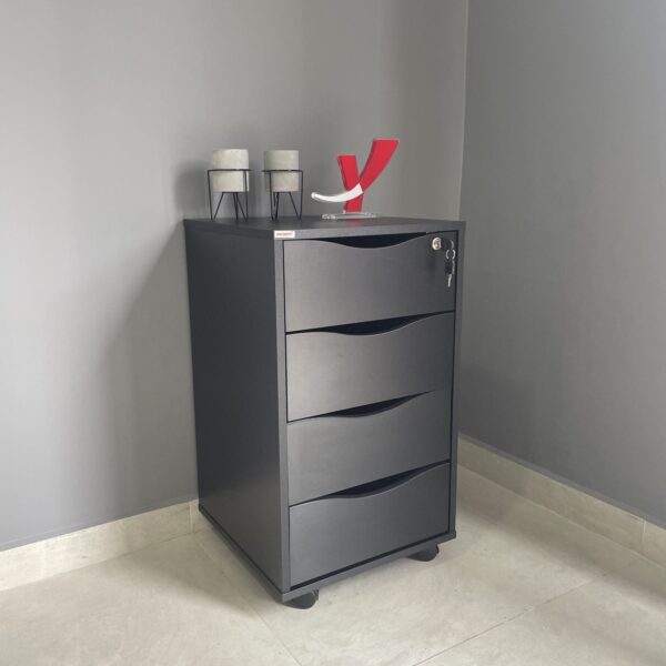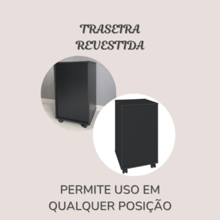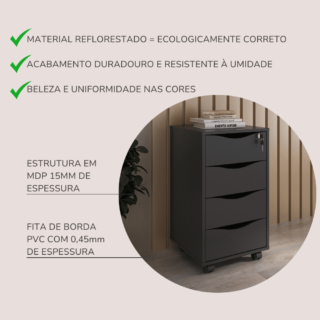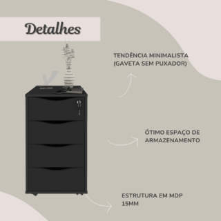 As gavetas funcionam com corrediças metálicas, que proporcionam um bom deslizamento. O gaveteiro possui rodízios para um transporte mais prático e fácil, além de, dessa forma, manter o chão sem riscos.