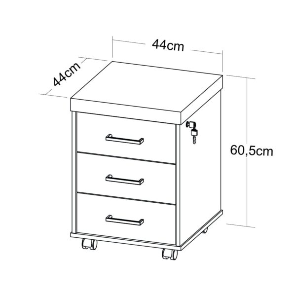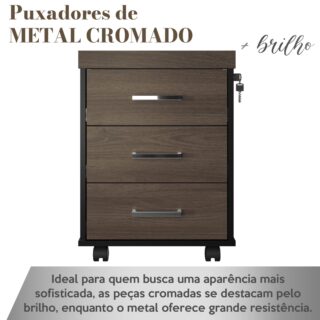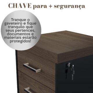 O gaveteiro possui puxadores em metal cromado, garantia de qualidade, brilho e resistência. Conta com chave para que você possa guardar documentos, papéis e objetos pessoais com total segurança. O revestimento é em BP e as bordas são de PVC, proporcionando ao móvel durabilidade e resistência a impactos, umidade e atrito. Unindo praticidade e elegância, este produto é o que falta para seu escritório, sala de estudo ou home office ser muito mais organizado e proveitoso!