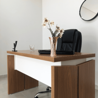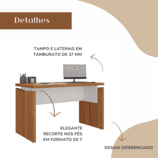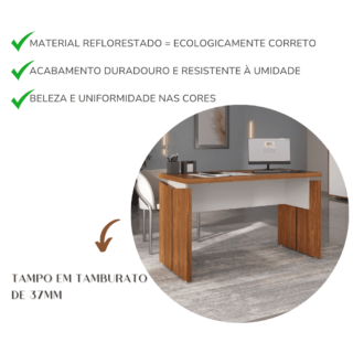 O espaçoso tampo garante muito conforto e comodidade, já que você poderá trabalhar ou estudar com amplo espaço para suas coisas. As laterais e o tampo são de Tamburato, peças de 37 mm de espessura, que garantem um produto robusto, forte e sofisticado. O revestimento é feito em BP e as bordas são de PVC, proporcionando resistência a impactos, atrito e umidade, certificando uma maior durabilidade ao móvel. O produto perfeito para aumentar o bem estar e a eficiência no trabalho, já que possui o tamanho ideal para maior conforto e produtividade!