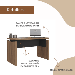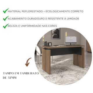O espaçoso tampo garante muito conforto e comodidade, já que você poderá trabalhar ou estudar com amplo espaço para suas coisas. As laterais e o tampo são de Tamburato, peças de 37 mm de espessura, que garantem um produto robusto, forte e sofisticado. O revestimento é feito em BP e as bordas são de PVC, proporcionando resistência a impactos, atrito e umidade, certificando uma maior durabilidade ao móvel. O produto perfeito para aumentar o bem estar e a eficiência no trabalho, já que possui o tamanho ideal para maior conforto e produtividade!