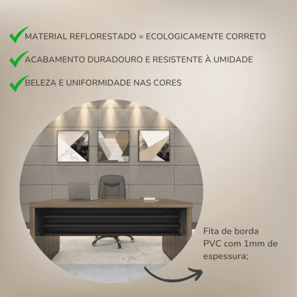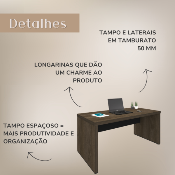 Organize seu escritório para maior produtividade com a Mesa Tamburato 1600, projetada para conciliar elegância, requinte e conforto. Longarinas horizontais garantem um design contemporâneo e versátil, permitindo com que a mesa possa ser usada em diversos ambientes com estilos diferentes, inclusive em home office, sempre dando um toque especial. O espaçoso tampo garante muito conforto e comodidade, já que você poderá trabalhar ou estudar com amplo espaço para suas coisas. As laterais e o tampo são de Tamburato, peças de 50mm de espessura, que garantem um produto robusto, forte e sofisticado. O revestimento é feito em BP e as bordas são de PVC, proporcionando resistência a impactos, atrito e umidade, certificando uma maior durabilidade ao móvel.