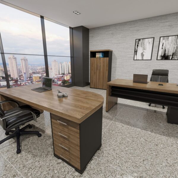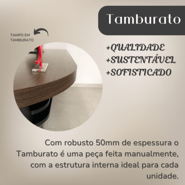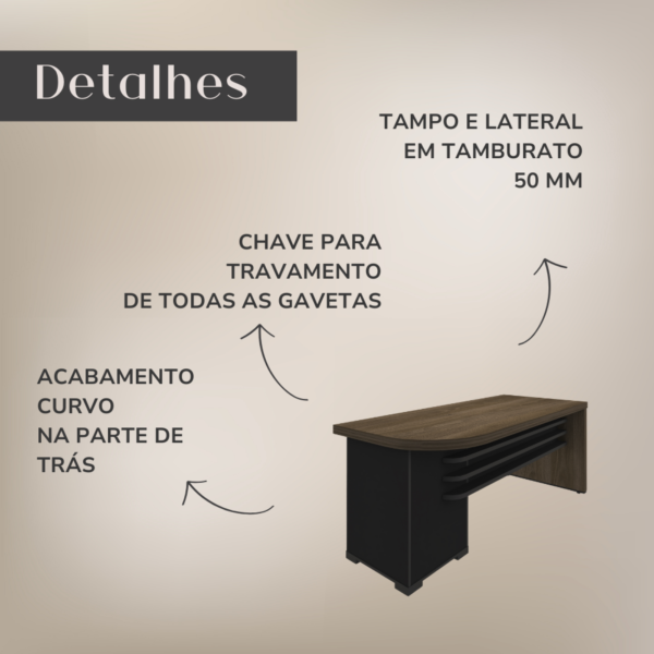 Laterais e tampo em Tamburato de 50mm de espessura garantem a qualidade e a robustez de móveis de alto padrão. O revestimento feito em BP e as bordas de PVC asseguram resistência a impactos, atrito e umidade, fazendo com que seu móvel permaneça conservado e duradouro. Com design elegante e versátil, este produto pode ser usado nos mais variados tipos de escritório e também em seu home office.