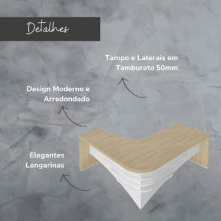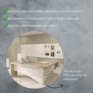 Visando maior funcionalidade e conforto, a mesa possui uma ampla superfície de trabalho, para que você possa acomodar tudo o que for necessário de forma fácil e prática. Revestimento em BP e bordas em PVC proporcionam ao móvel maior durabilidade e resistência a impactos, umidade e atrito. Você vai se encantar!