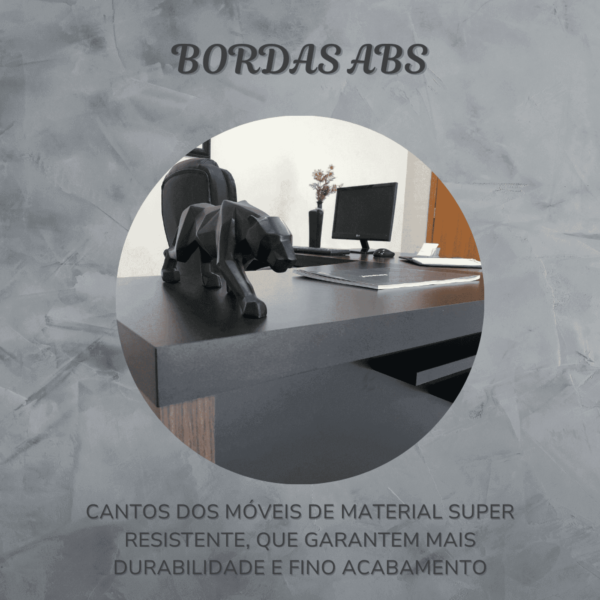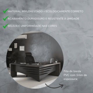 Visando maior funcionalidade e conforto, a mesa possui uma ampla superfície de trabalho, para que você possa acomodar tudo o que for necessário de forma fácil e prática. Revestimento em BP e bordas em PVC proporcionam ao móvel maior durabilidade e resistência a impactos, umidade e atrito. Você vai se encantar!