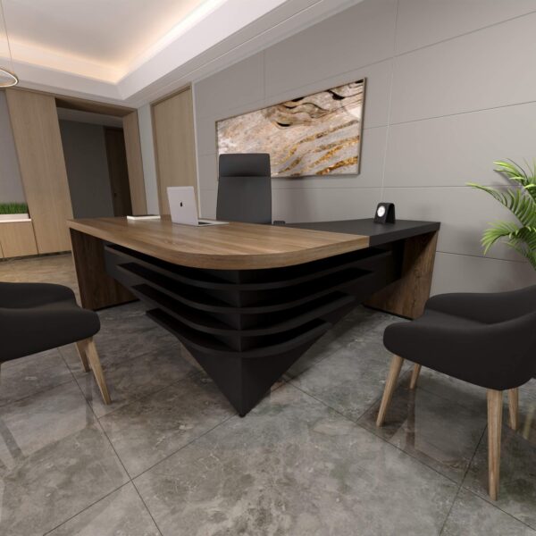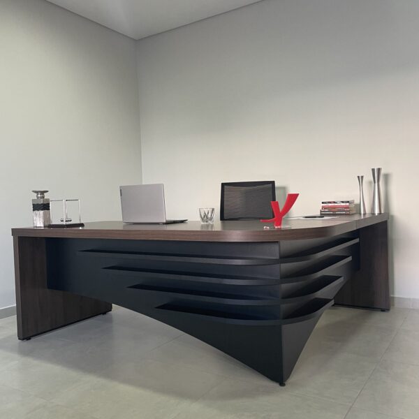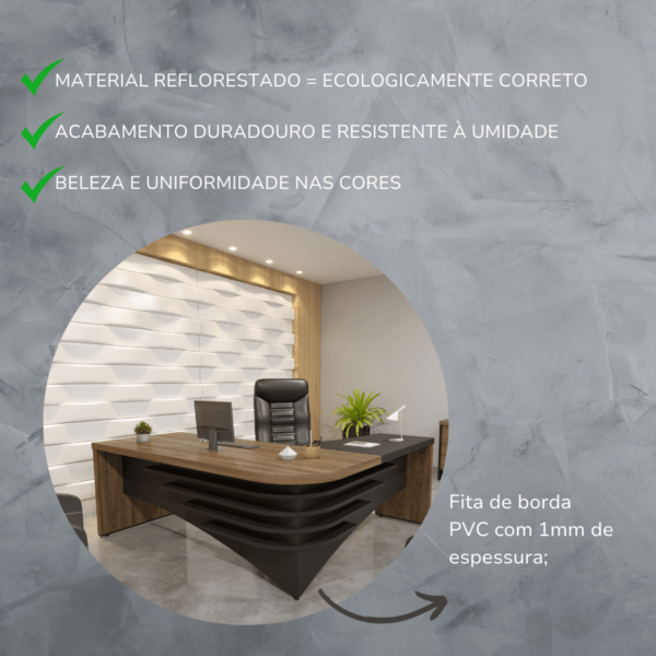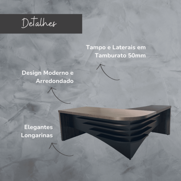 Decore e organize seu escritório para maior produtividade com a Mesa Diretor, que possui design moderno e arrojado, deixando o ambiente sofisticado e requintado! Com estrutura em MDP, e partes em Tamburato de 50mm de espessura, o móvel é robusto e de alta qualidade, o que garante sofisticação a qualquer ambiente. Detalhes curvos na parte externa garantem elegância e um design único e contemporâneo ao produto.