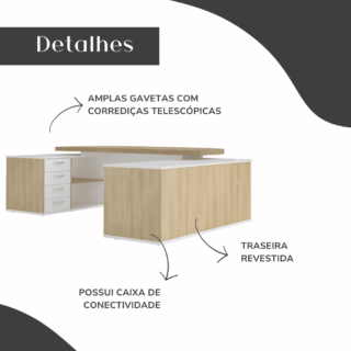 Pensando na sua praticidade e conforto, esta linda mesa para escritório é completa, pois oferece muito espaço para trabalhar e armazenar materiais, em 4 gavetas, 2 portas de correr e muitas prateleiras, além de espaço ideal para CPU e caixa de tomada. Além disso, a leve curvatura na parte interna do tampo a tornam ainda mais ergonômica.
