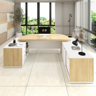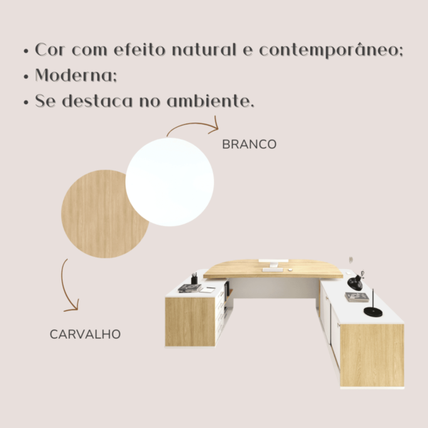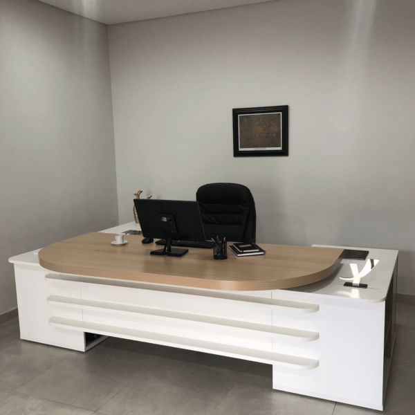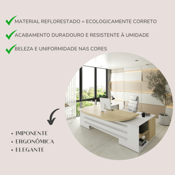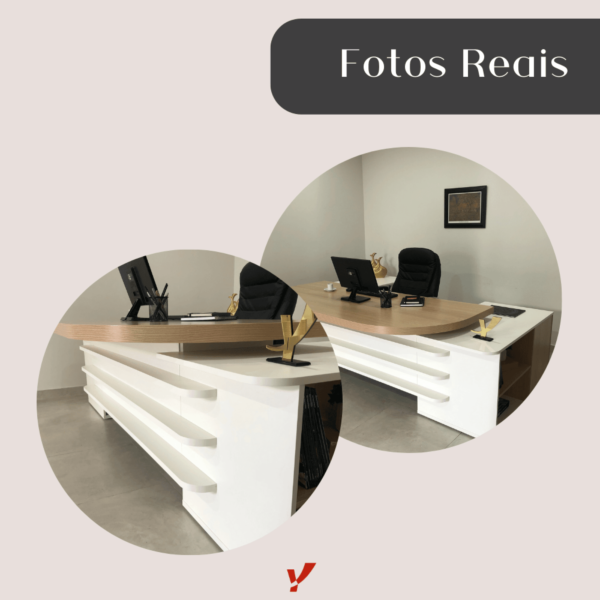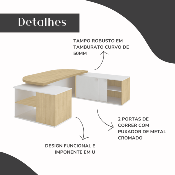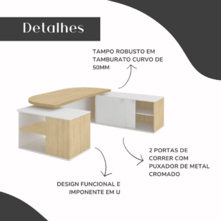 Seu escritório totalmente sofisticado e funcional, com esta encantadora mesa em “U”! Realmente grande e espaçosa, ela é muito imponente e vai impressionar a todos com seu design moderno e autêntico, garantido pelas belas curvas e somado ao tampo sobreposto e muito robusto de Tamburato de 50mm de espessura!