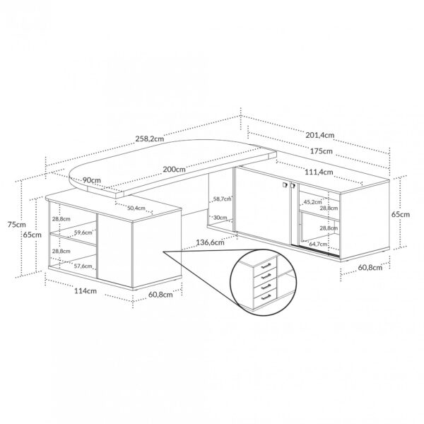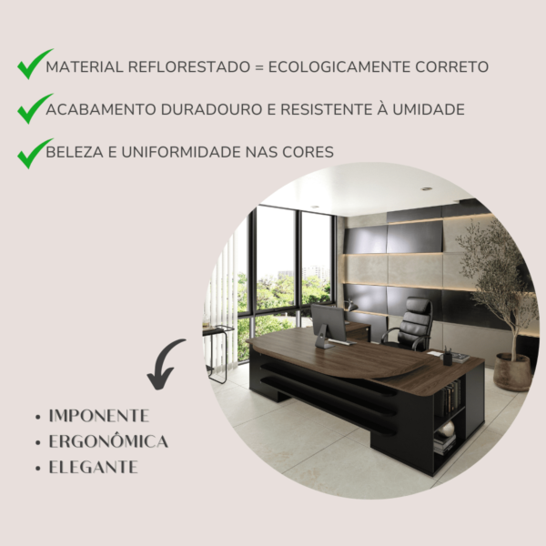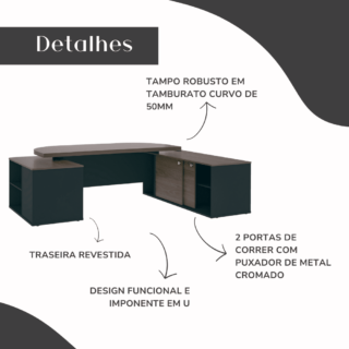 Seu escritório totalmente sofisticado e funcional, com esta encantadora mesa em “U”! Realmente grande e espaçosa, ela é muito imponente e vai impressionar a todos com seu design moderno e autêntico, garantido pelas belas curvas e somado ao tampo sobreposto e muito robusto de Tamburato de 50mm de espessura!