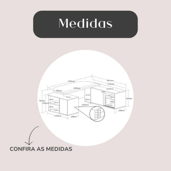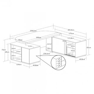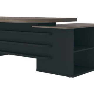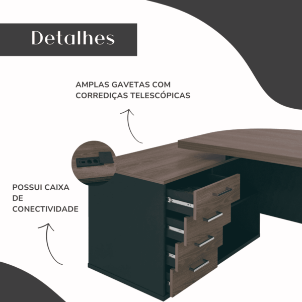 Pensando na sua praticidade e conforto, esta linda mesa para escritório é completa, pois oferece muito espaço para trabalhar e armazenar materiais, em 4 gavetas, 2 portas de correr e muitas prateleiras, além de espaço ideal para CPU e caixa de tomada. Além disso, a leve curvatura na parte interna do tampo a tornam ainda mais ergonômica.